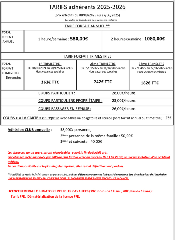 • Toute activité équestre, même de courte durée, entraîne le paiement d’une adhésion annuelle au club. En cas d’arrêt en cours d’année elle n’est pas remboursable.